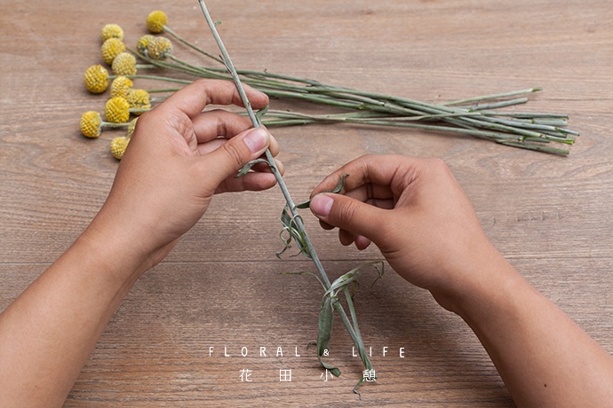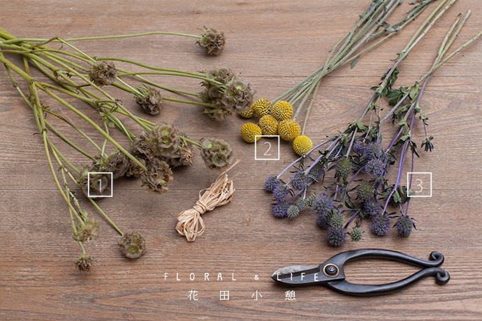 为了方便大家在花材搭配时的选择,花田小憩特设香味等级图谱,供大家在学习过程中了解更多植物的属性,以方便作品选择更适合的空间位置陈列。精选质地明亮鲜艳、花型充盈饱满的金槌花,根据作品的需要,去除茎干部分多余的枝叶,保持花枝的干净与整洁。