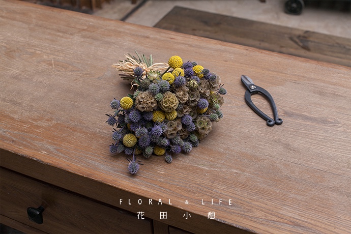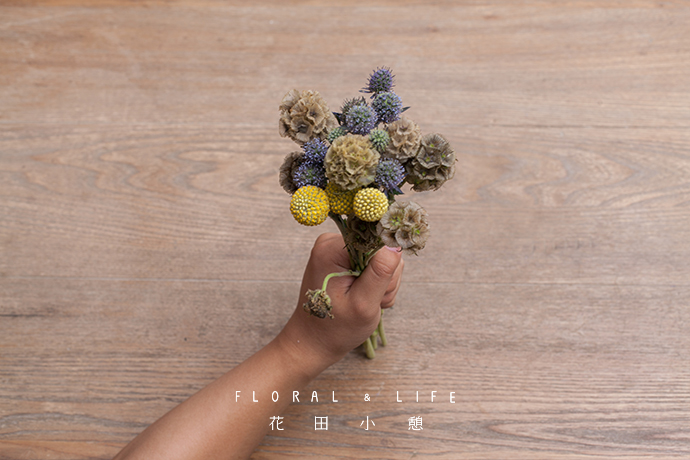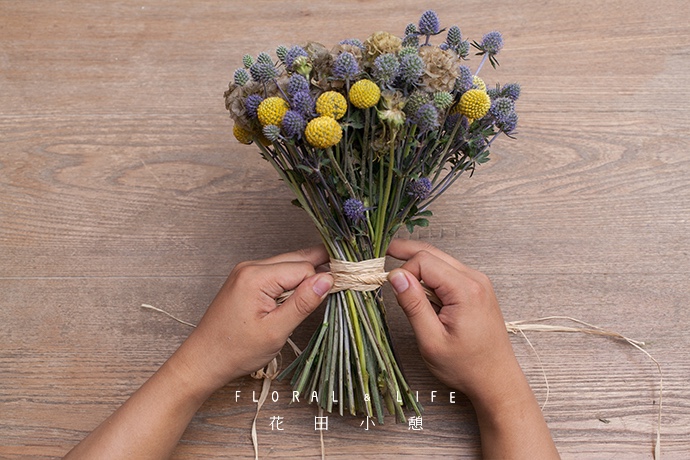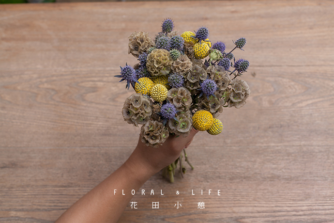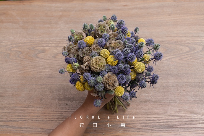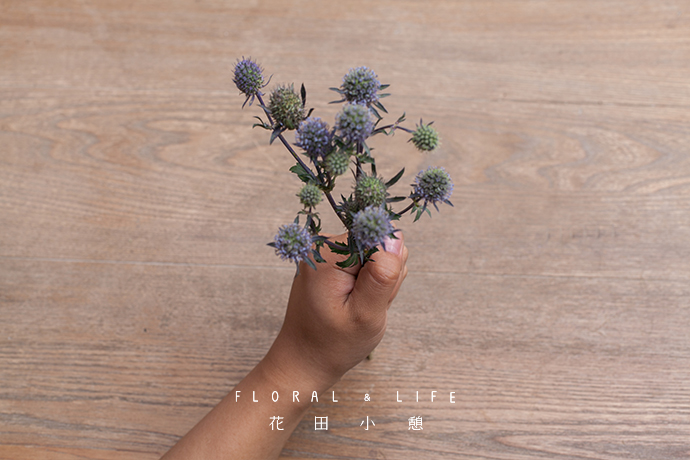 风车果、刺芹、金槌花的花型具有蓬勃的生机感,进行搭配时应保证花材间整体和谐,让作品造型更显生命力,并