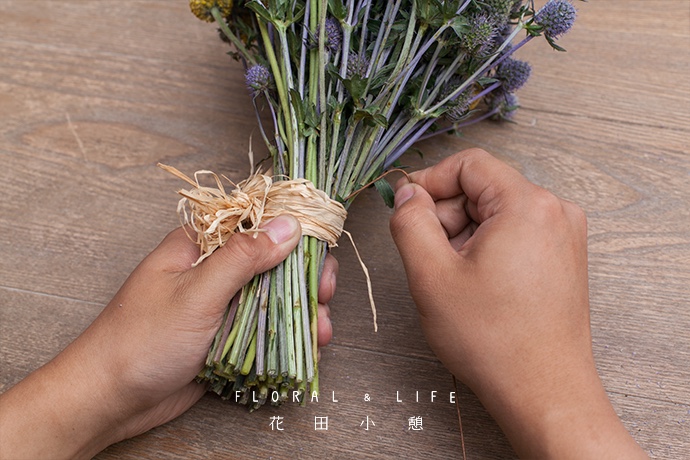 选用适当长度的拉菲草,将花束进行捆扎以便于造型的稳固。在捆扎的过程中,尽量保证花材高度一致,突出作品的整体丰盈感。