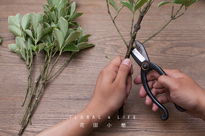 将裁剪好的绣球叶补入花叶黄杨的侧面,依据构图需要插入大量辅枝,保证内部结构的紧密、丰满,完善作品整体造型。