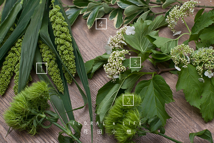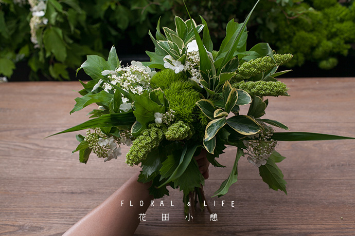 - 作品配色 -1.以绿色作为主要的颜色,通过将谷子、石竹球、花叶黄杨、绣球叶进行混搭,呈现出自然大方的盎然气息。花叶黄杨的白色花朵具有多彩的静态美,作为花束的点缀,突显出温馨浪漫的感觉。