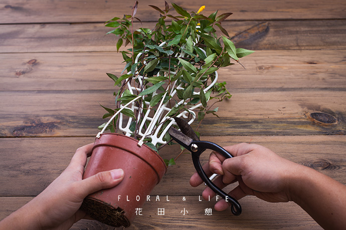 树枝在修整过程中,针对花材所需长度进行适当剪短。在裁剪过程中,需注意树枝与法国香水花的协调性,保证两者能相互附着展现出优雅的线条。