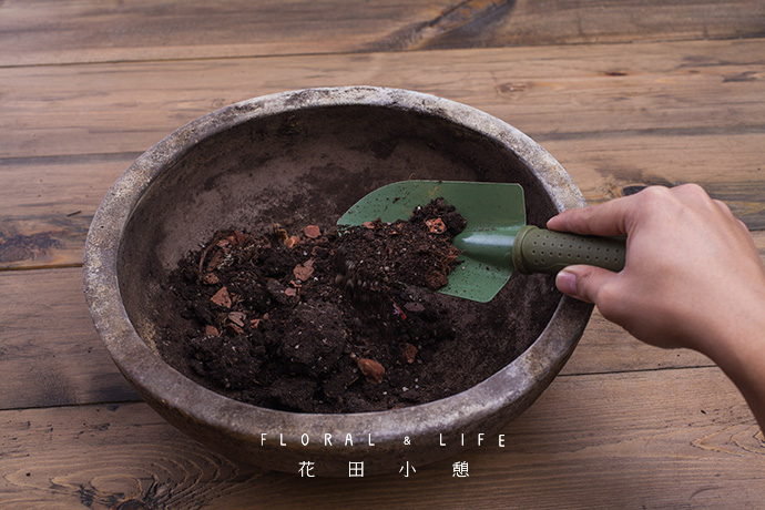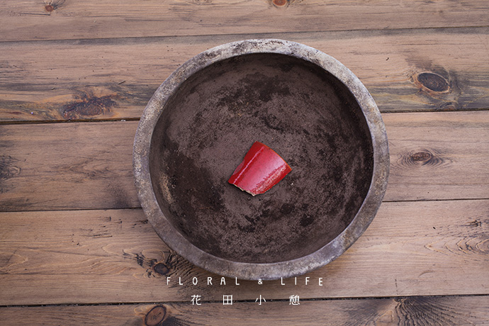 花材浇水以充分浇透为标准,令水气滋润植株. 在器皿底部放置一枚瓦片,可防止水分散失和盆土随水流出造成的脏污。