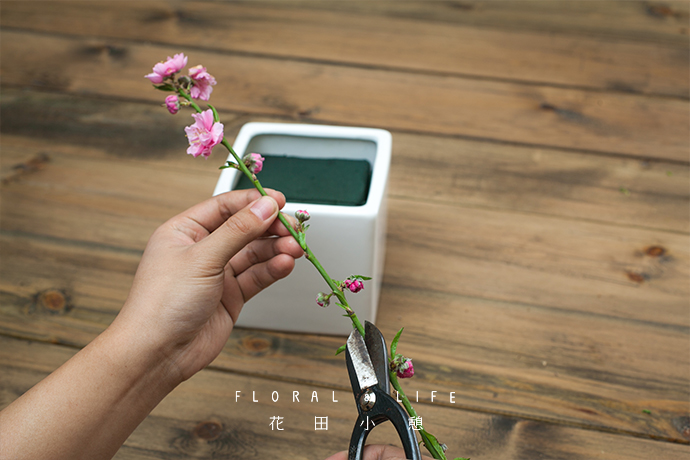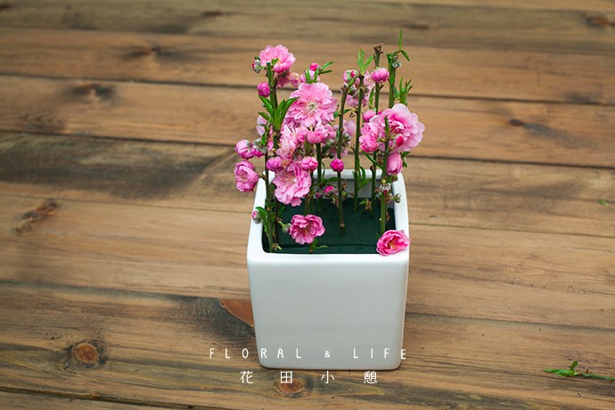 最后将桃花摆放在庭院一角,让一抹“粉嫩”带来春意盎然的感受,作品完成。