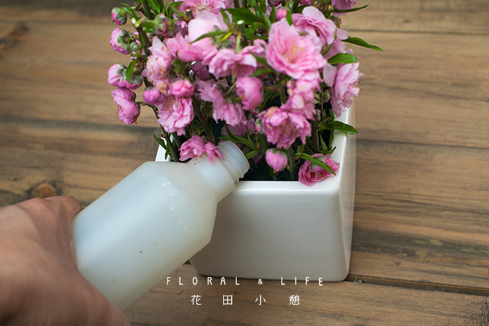 插花时合理用水,可保持花材能长时间“青春常驻”,选择质地较为纯净的清水倒入器皿中,保持花泥的湿润程度。