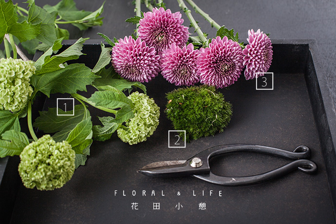 木绣球有着可爱的小花形,是当做填充花最好的选择。在本次作品中,以乒乓菊作为亮色的表现,再以木绣球填充较空的位置,形成强烈的色彩对比。