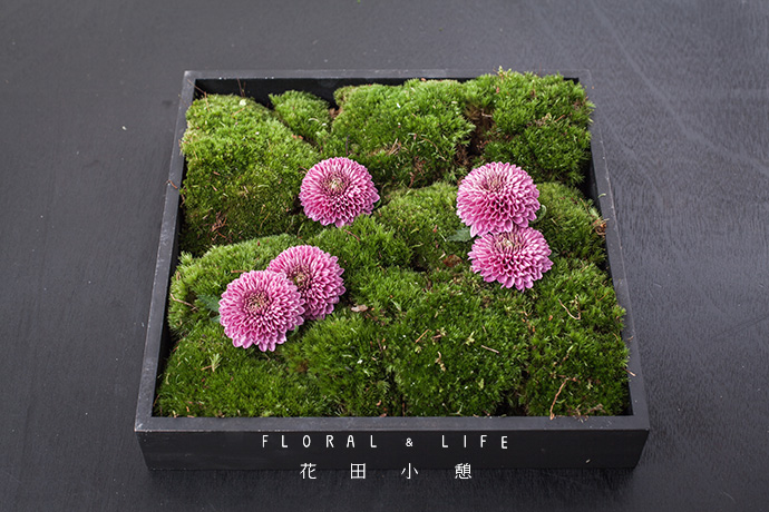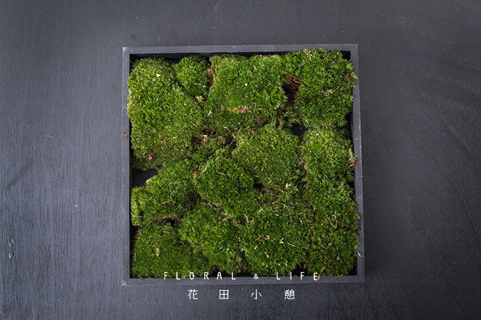 苔藓是花艺制作中并不常见的搭配材料,将准备好的苔藓放置于深色的方形花器中,增添了一抹南法的乡村风情。