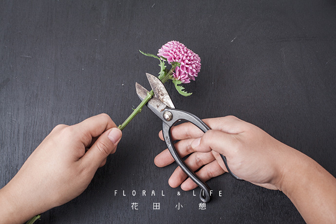 花材选取过程中,尽量以花朵充实饱满,且色彩鲜明的为主. 而茎杆粗壮、挺直也能观测出花材新鲜程度,同时应确保切口整齐和干净。在材料选择时尽量选择质地鲜艳、花朵饱满的乒乓菊。