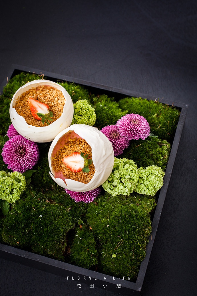 1.本次作品中,通过绚丽的乒乓菊和古朴的木绣球,为作品整体增添了一份古典浪漫的气质。最后放置的甜品,则为作品带来了超脱视觉的想象,如同两只枝头小鸟,唱着一首优雅的法式香颂。