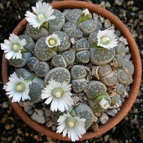 生石花(学名:Lithops),又名石头玉、屁股花。因其形如彩石,色彩丰富,娇小玲珑,享有“有生命的石头”的美称。植物顶部有一裂缝,裂缝中开花,花朵大都呈雏菊状,一般在盛夏至中秋盛开。