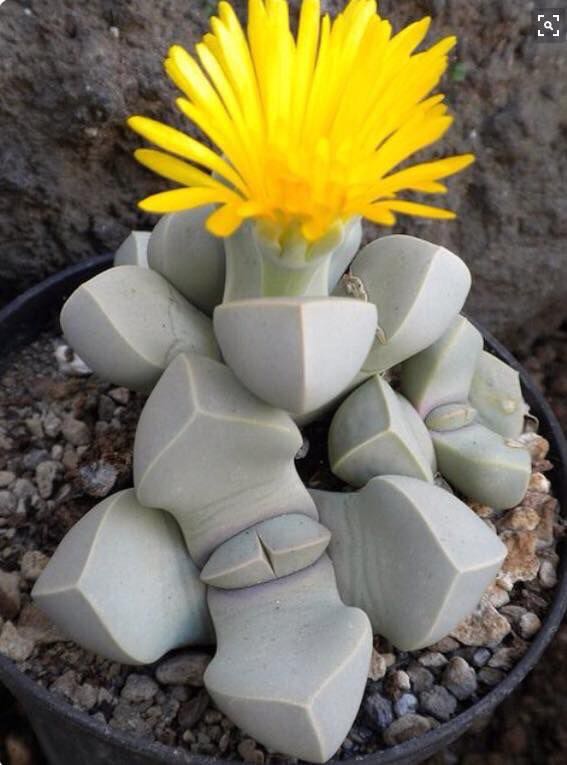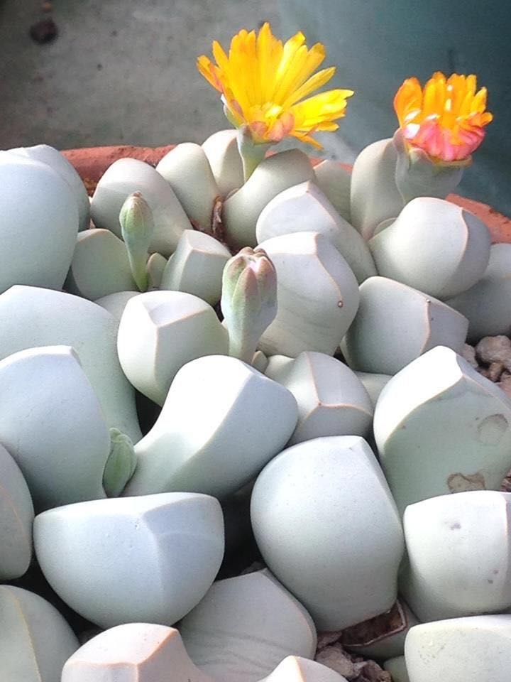 看似像屁股一样的部位,其实是生石花的叶片,不同品种显示出各式花纹,颜色多变,好似鹅卵石又像刚开始分裂的细胞,非常奇特。平常看似不起眼的“屁股”,开出来的”小菊花“是不是让人惊艳不已呢?丑萌的外形加上特殊的习性也绝对算是多肉家族中的一枝奇葩了!
