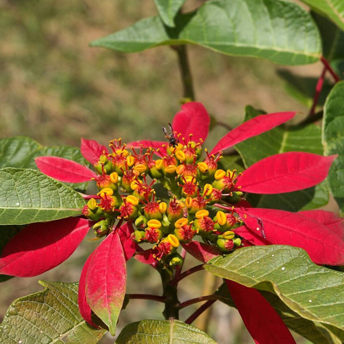 生态习性:一品红植株茎光滑,含乳汁,叶片互生,全缘或浅裂。杯状花序顶生,聚伞状排列,总苞淡绿色,下方有一大型红色的花瓣状总苞片,是观赏的主要部分。