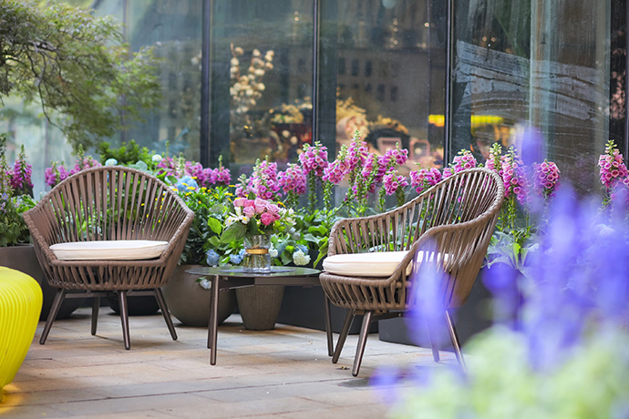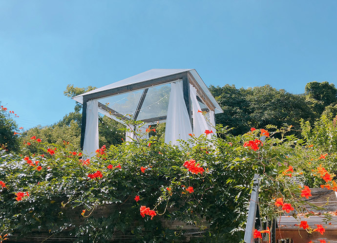 它虽位于杭州市中心却隐秘幽静,像是刻意藏着美好不让过多的人发现。郁郁葱葱的地锦和凌霄花包裹的是全透明的玻璃房和房顶阳台,所有与花有关的一切美好都会在这里发生。