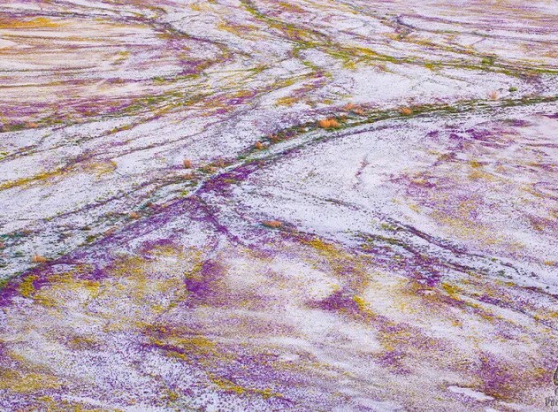 要知道,植物要在干旱的沙漠地区生长存活并不容易,水分一旦减少它们便会随之消失。但也正因为这极端气候,蝎子草和仙人掌花就会争分夺秒吸收水分,迅速开花和繁殖,然后每年在气候许可的情况下这里会一夜间变成遍地野花怒放的花海,鲜艳的花朵从干旱的土地空隙破土而出,为荒凉的大地带来一派生机勃勃的景象。不过,它们的出现非常的短暂,无水即消失。