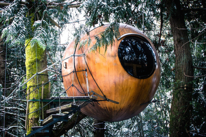 位于温哥华岛一座温带雨林里。它的房间被蜘蛛网状的弹力绳子悬挂在树顶上。这些光滑的木质小屋被设计成能与周围环境共存的样式,使树木和野生动物受到的影响最小。享乐设施位于坚固的地上,包括浴室和一个桑拿房。森林不远处便是哥维根谷的葡萄酒庄和工匠餐厅。
