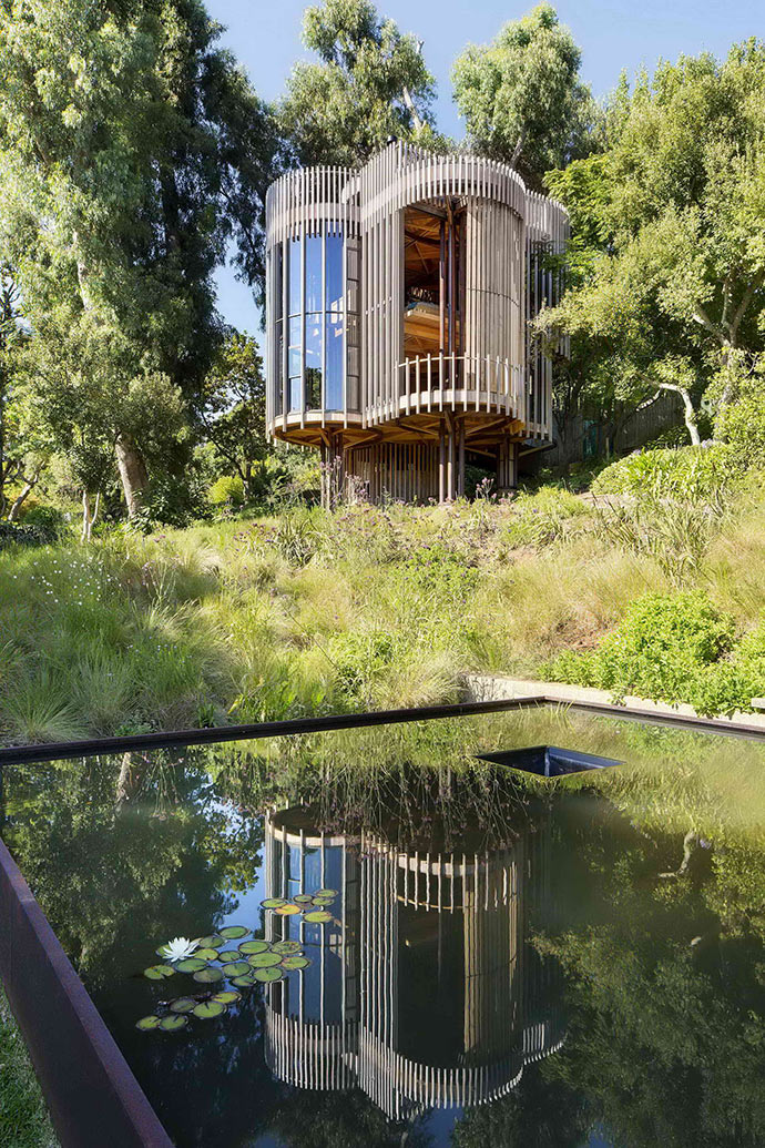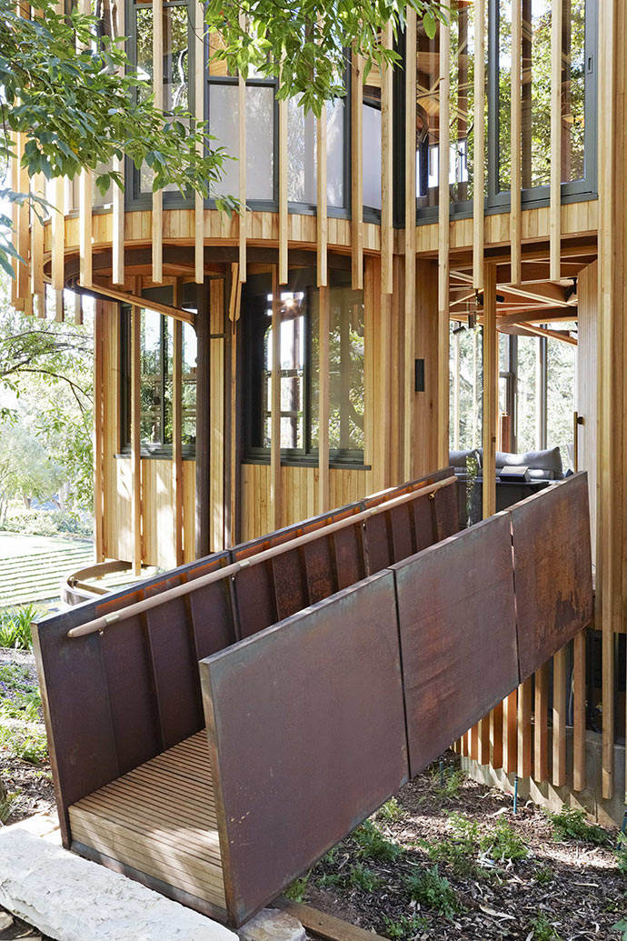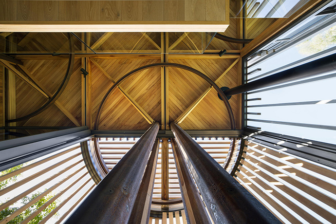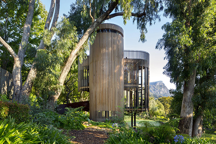 开普敦树屋是一个垂直布置的“林中空地”,客厅位于第一层,卧室位于第二层,屋顶平台位于第三层。机房位于底层。而且所有的建材表面都没有精加工,可以像四周的树木一样自然地风化以表现时间的流逝。