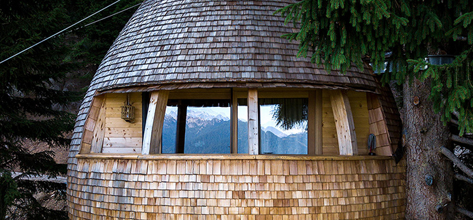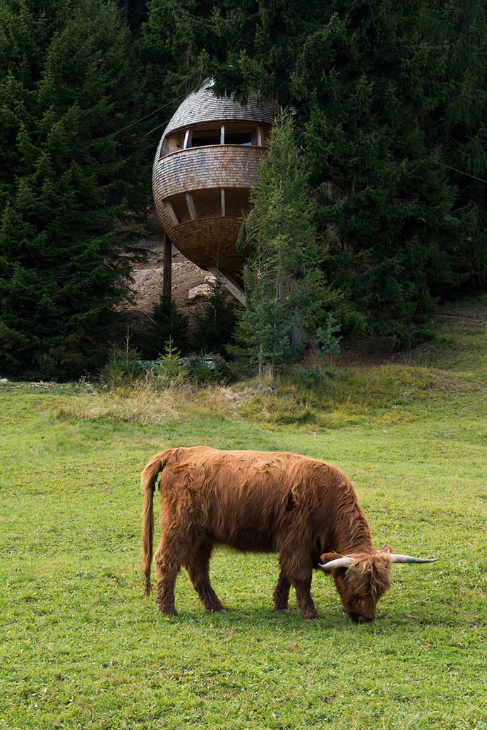 锥形树屋住宅位于意大利最古老的森林中,每个树屋共三层,分为两个部分,离地十米高。其中第一个树屋离地面上四米高,作为一个全景的露台。第二个树屋通过两个带有滑动门的大窗户引入内部。有客厅、厨房、浴室和卧室。