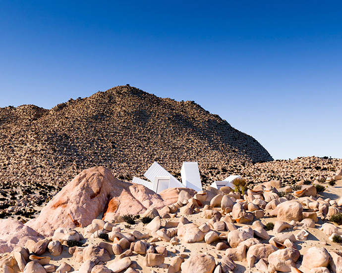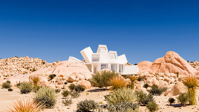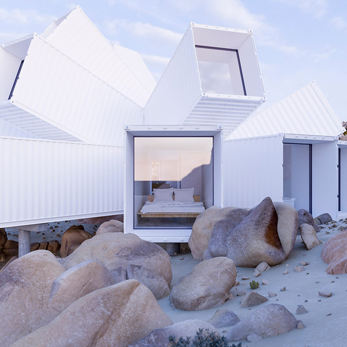 约书亚树公寓外表看起来就像一个个白色的集装箱堆叠而成。映衬着蓝天和黄沙,犹如荒芜的沙漠之花绽放。