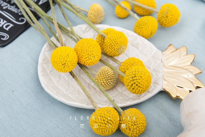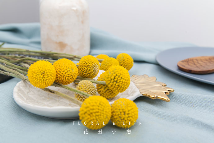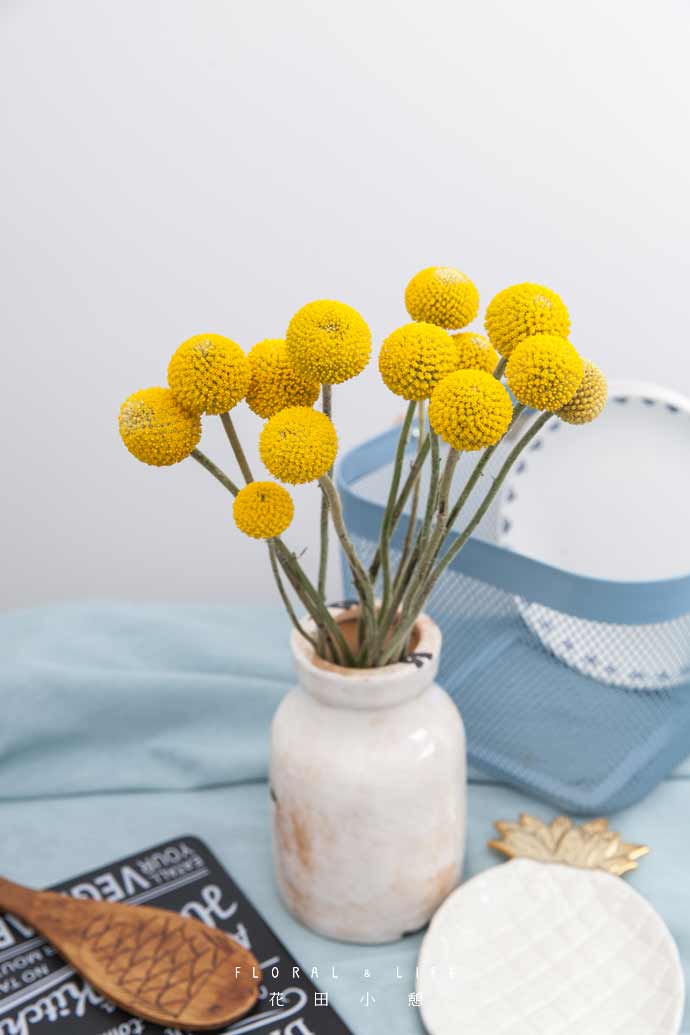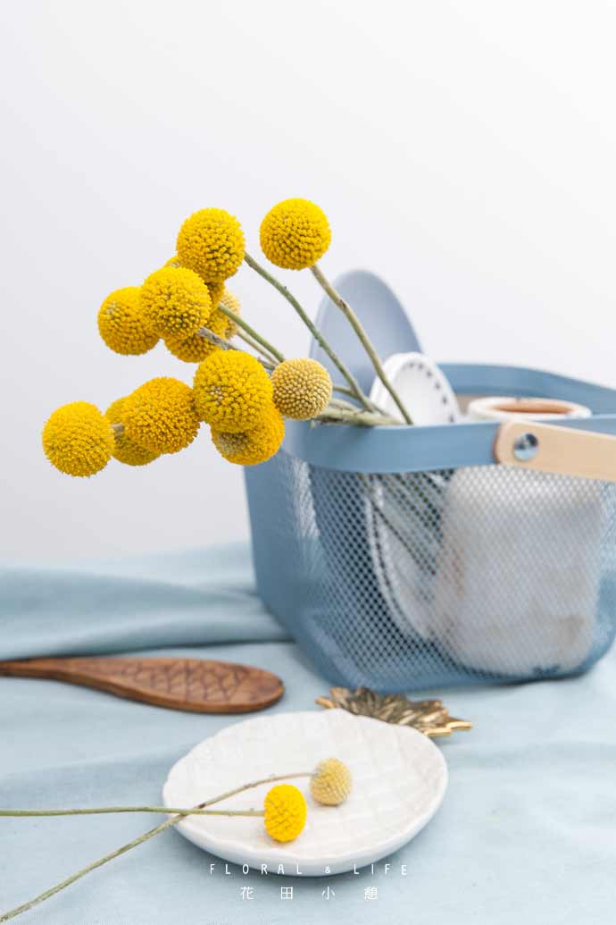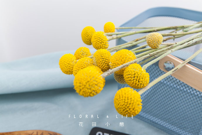 黄金球是一种十分适合制作干花的花材,产季为3月至5月。它干燥后脱色不是很明显,茎杆也不会垂软,不管是用于花束还是其他手作的花饰上都十分醒目、可爱。