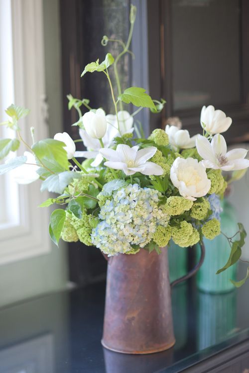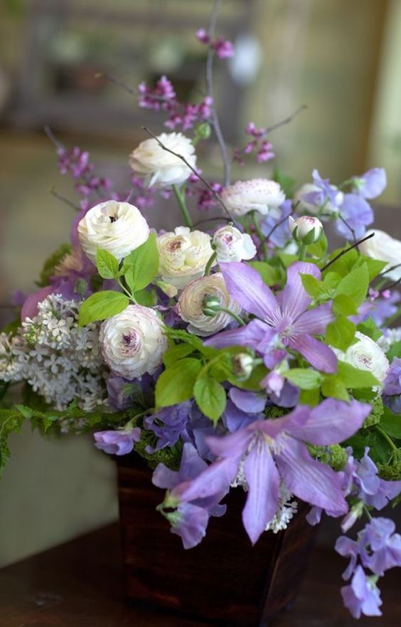 在花艺作品中选用深色花瓣的铁线莲,可以为作品增添华丽典雅的神韵,明艳动人的作品一定令你深深着迷。