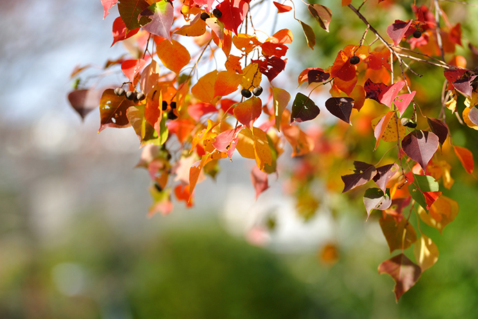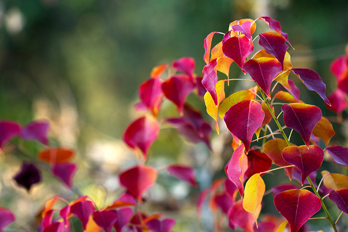 乌桕树又称木子树,在中国的栽种历史非常悠久,深秋时节,乌桕树的叶子颜色鲜红,非常醒目。乌桕的叶子是菱形广卵状,叶柄细长。