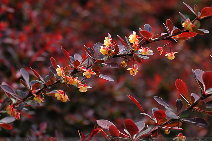 红叶小檗也叫紫叶小檗,是小檗科小檗属落叶灌木,幼枝紫红色或暗红色,老枝灰棕色或紫褐色。叶小全缘,菱形或倒卵,紫红到鲜红,叶背色稍淡。果熟后亦红艳美丽。