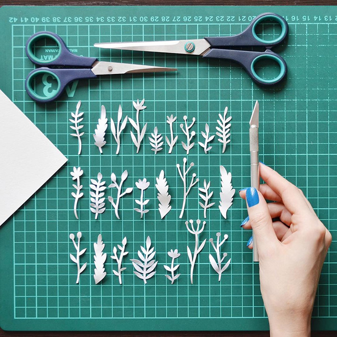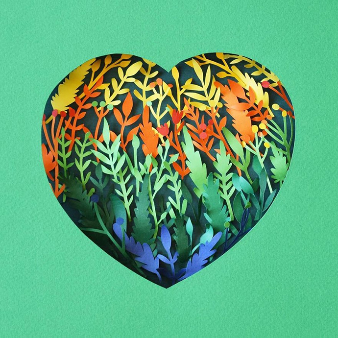Margaret很喜欢先将纸张切割出各种各样的小植物,然后将它们与作品的构图和叙事性相结合,让人感受到茂盛的植物带来的生命力。剪切这些小植物的过程需要非常的耐心,这对于Margaret来说如同进入冥想的境界。