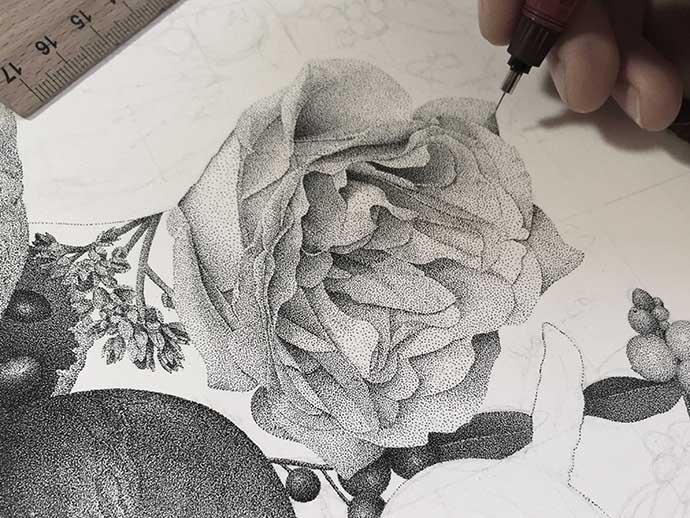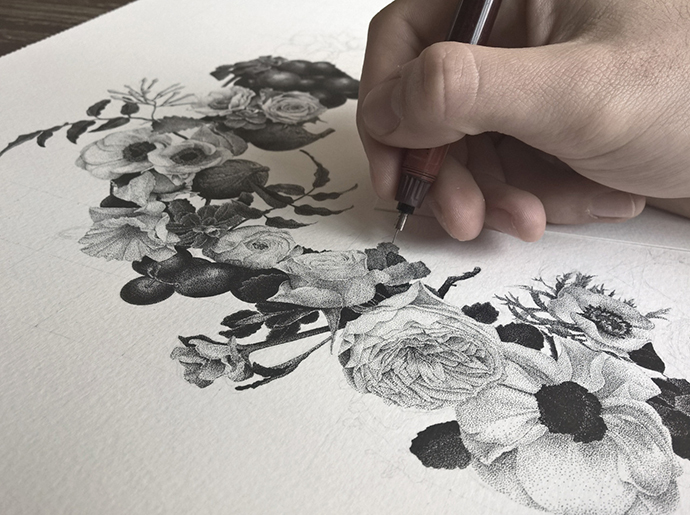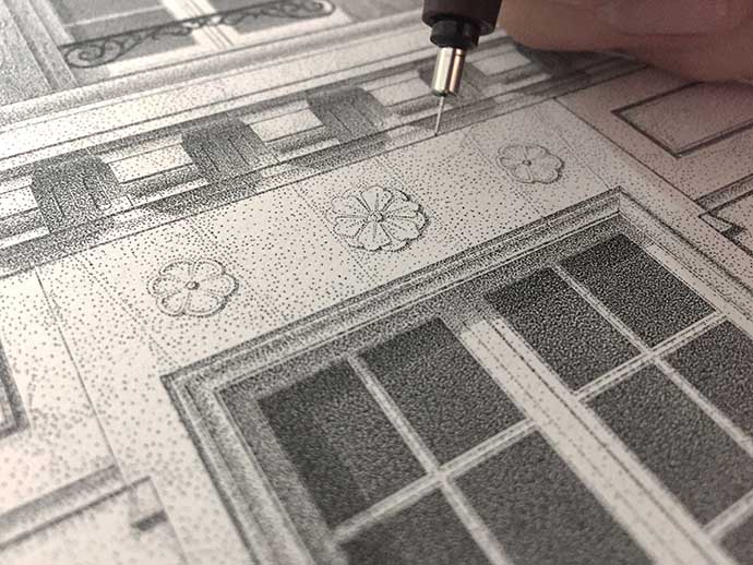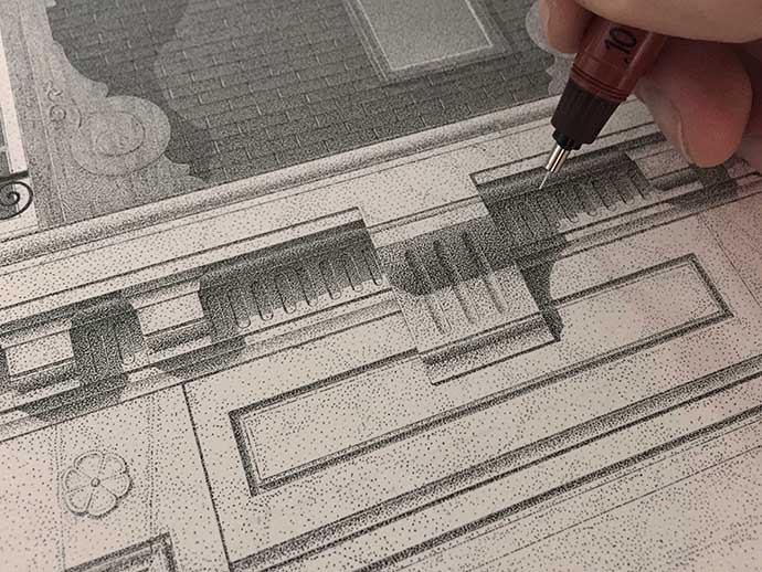 点画是一种非常简单的绘画技法,笔尖在纸上轻微地接触,留下微小的墨点,墨点构成线条和块面,从而实现复杂的构图。法国年轻艺术家Xavier Casalta将这一技法运用得炉火纯青,他绘制的点画作品如同印刷品一样流畅逼真,小意达形容他为“