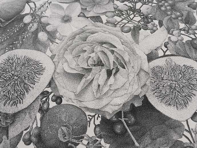 Xavier Casalta初期的点画作品以字体设计为主,之后开始绘制越来越复杂的作品,如今的主要题材以写实风格的植物为主。他正在完成一组四季系列的点画,分别描绘了四个季节的植物。
