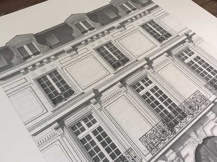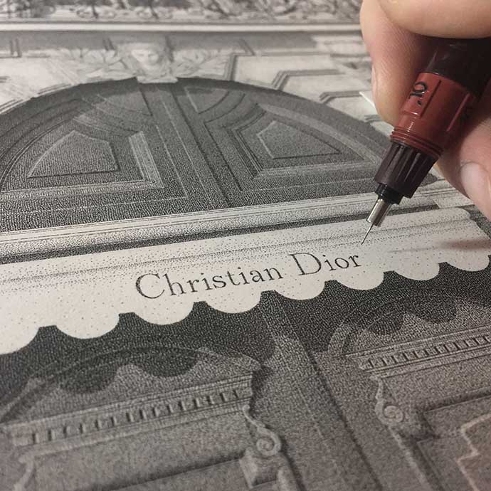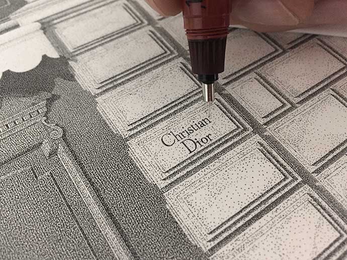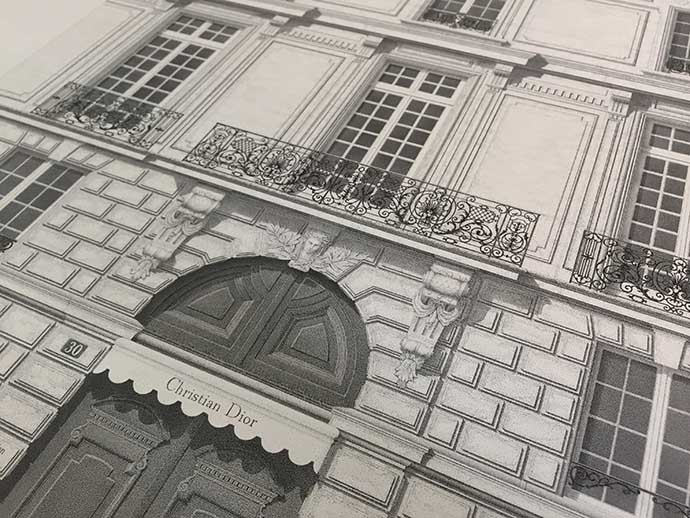 应Dior的邀请,Xavier Casalta将位于巴黎Montaigne大道30号的Dior总店外观以点画的形式画了下来。这件店铺对于Dior来说意义重大,这是1946年,在时尚领域不断浮沉后,已经不惑之年的克里斯汀·迪奥在巴黎开的第一家个人服饰店。
