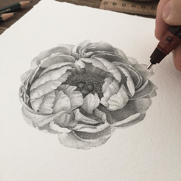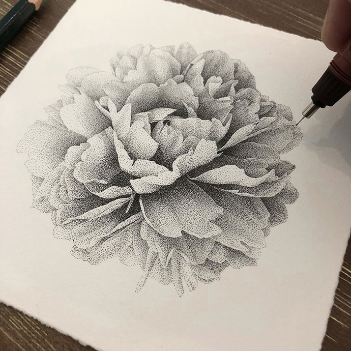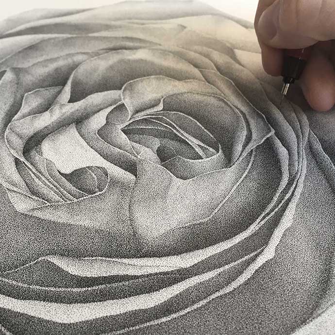 点画是一种谁都可以尝试的简单绘画技法,但只有付出惊人的耐心和毅力,才能点出成千上万个均匀的墨点,并将他们排列成复杂细腻的图案!Xavier Casalta的每件作品都要花费数百个小时才能完成。