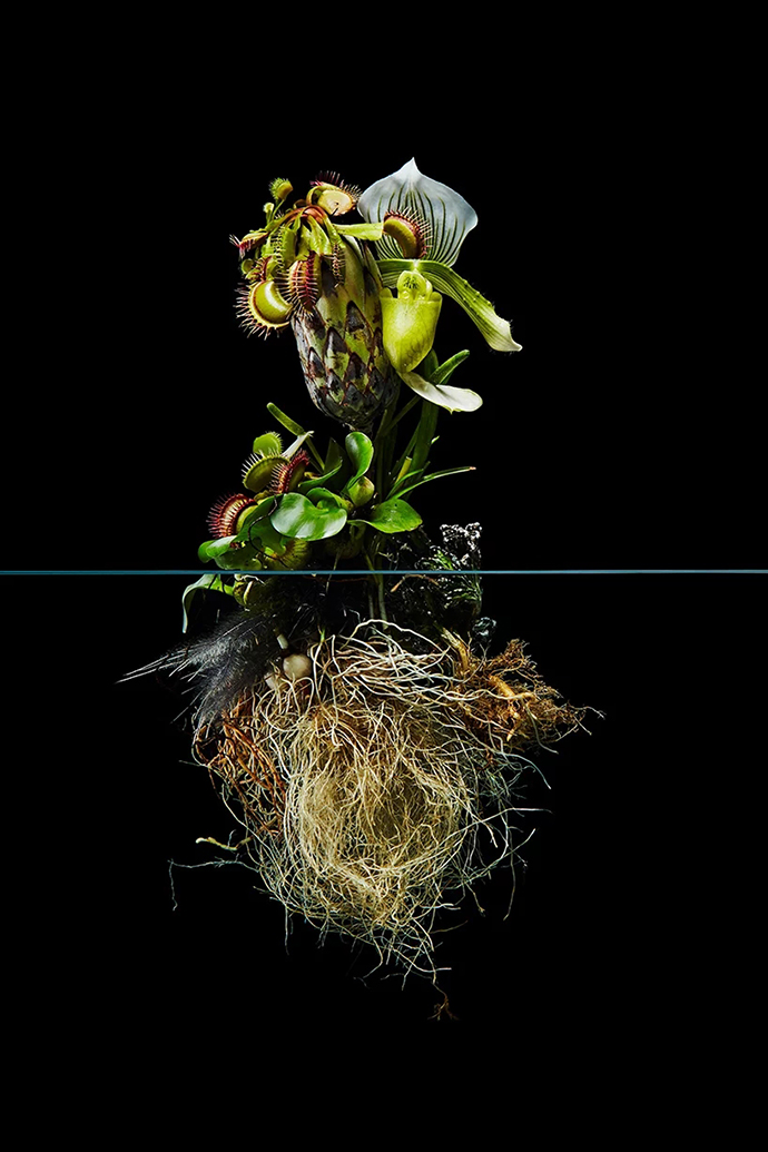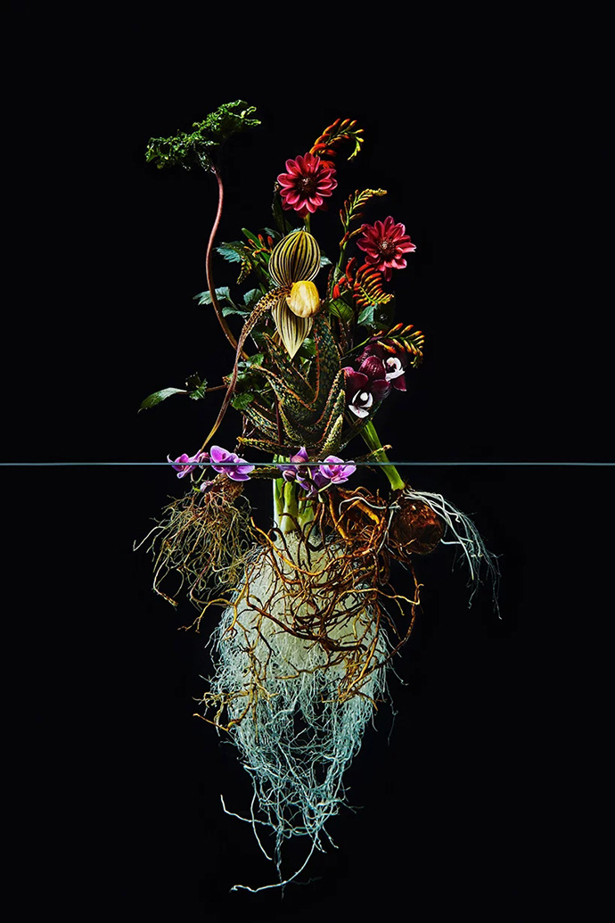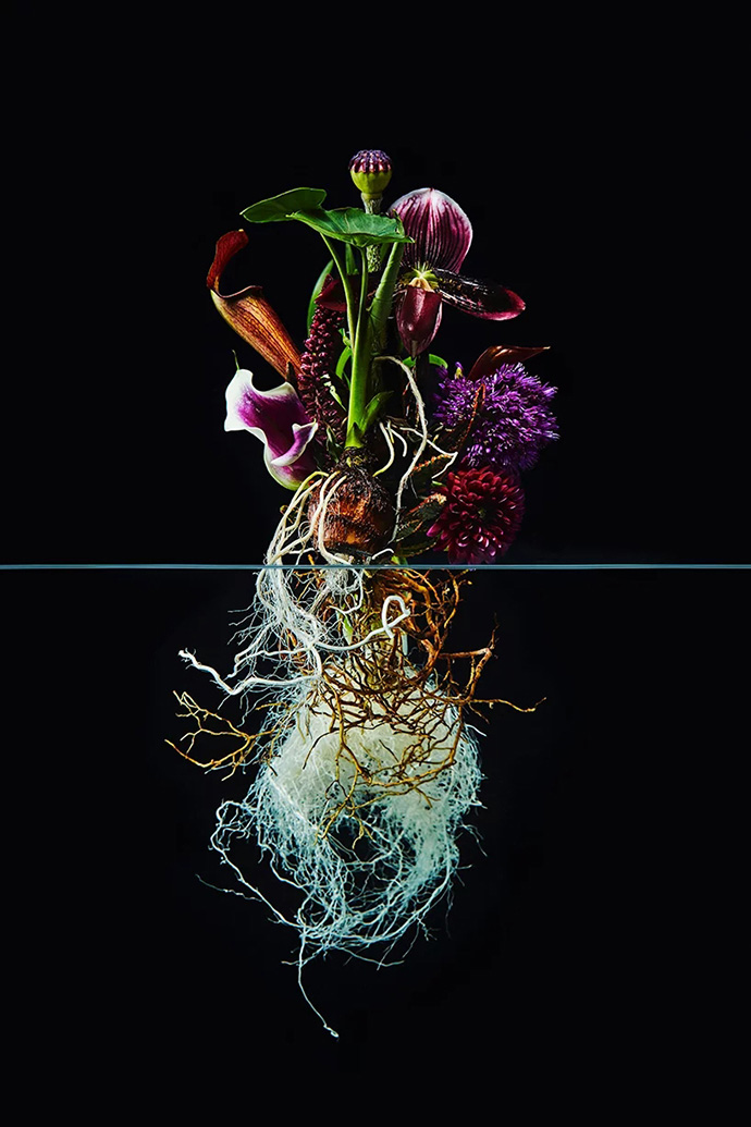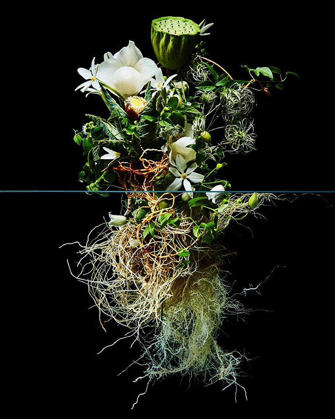 我们通常欣赏植物开花的部分,却忽略了植物隐藏在地下的部分。在Undersurface Flower这一系列里,植物的根系被被浸泡在水里,这些颇具动感的根系与水面以上的花朵形成了鲜明的对比。