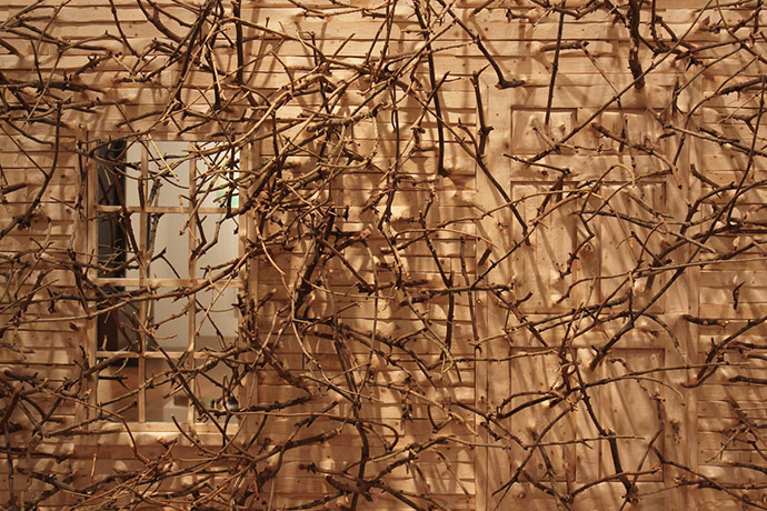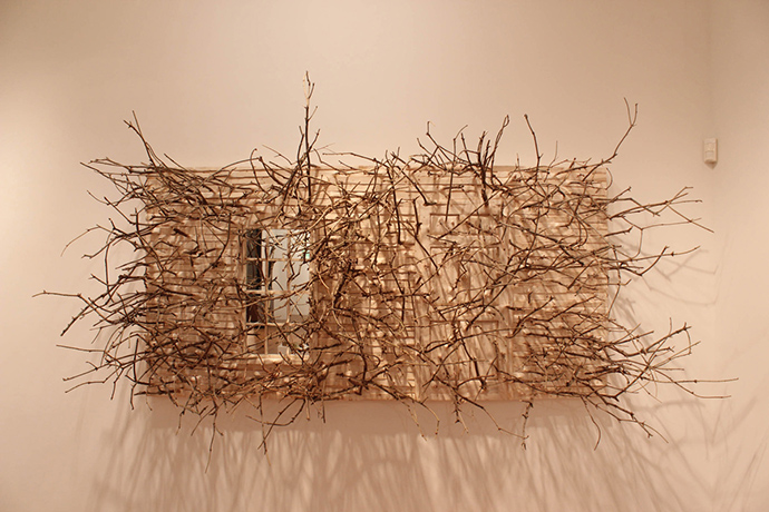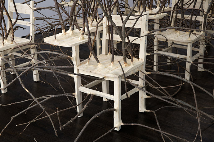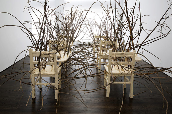 上面这件作品的名字叫Brier Patch,Hugh Hayden使用了6张学生课桌,杂乱生长的树枝让它们原本彼此独立的单元成为了不可分割的整体,秩序与随机、确定与不可预测……两相对立的元素同时表达在这个作品中。