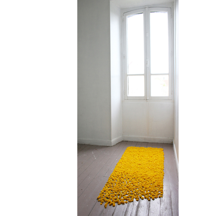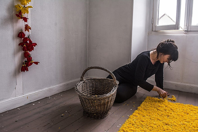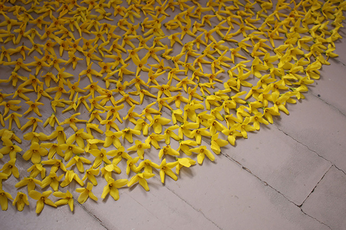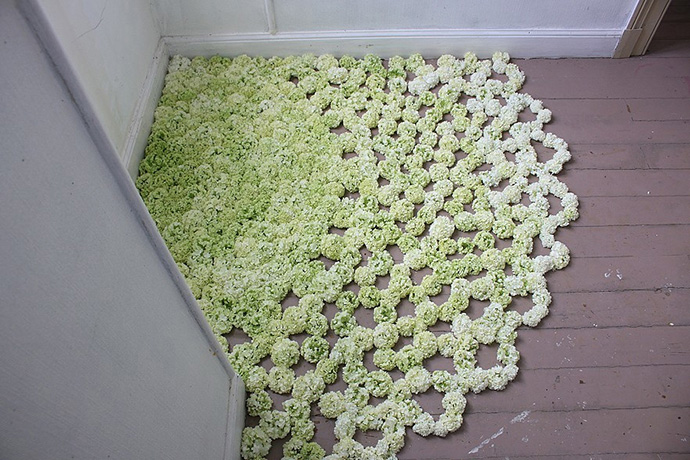 这是一个非常紧张而短暂的装置艺术,鲜花从断水开始只有几个小时的时间保持最好的状态,Jenine必须非常快速地完成装置。