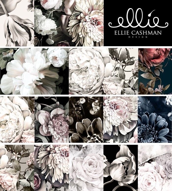 为了创造大规模花卉印花,Ellie Cashman运用了传统和数字艺术媒体结合。首先在一张大纸上或墙上贴几张纸,画一个粗糙的铅笔素描。Ellie Cashman用这个草图来确定“大局”,站在画的地方,挡住表格,确定规模和比例的元素,以及它们是如何相互联系的。退后一步,从远处看,开始思考设计将如何重复,然后Ellie Cashman把这张草图用她的iPhone拍成照片照片,将其导入到PS图象处理软件,并开始使用定制的Photoshop笔刷填充颜色和细节创建达到不同的效果。