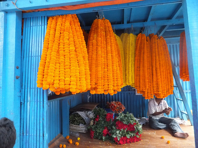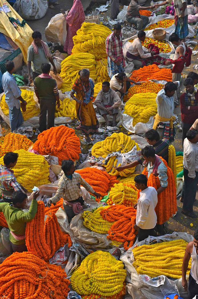 加尔各答的玛丽克河岸花市(Malik Ghat flower market)是印度最古老最大的花卉市场。每一天有超过2000个卖家在这里售卖金盏花花环、巨大的芒果叶、茉莉花、向日葵等等。这些花卉和植物在印度的各种礼仪、节日、婚庆中扮演着重要的角色,也是这些卖花郎们重要的生计来源。