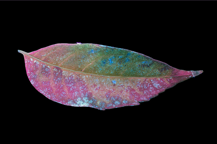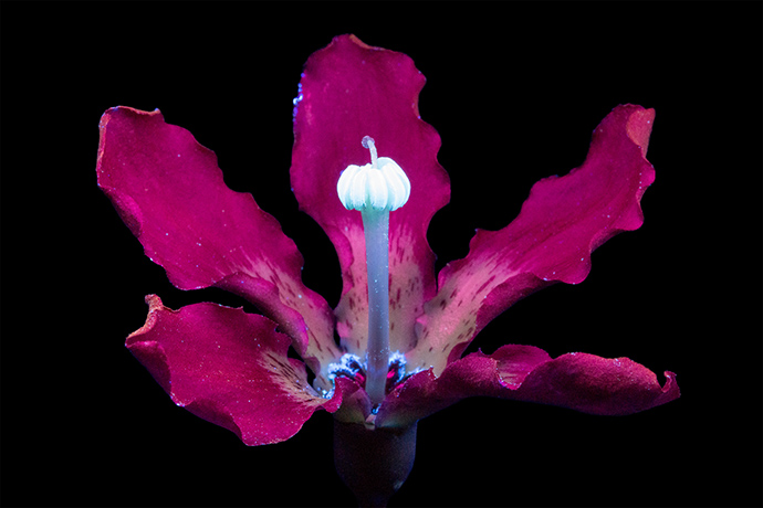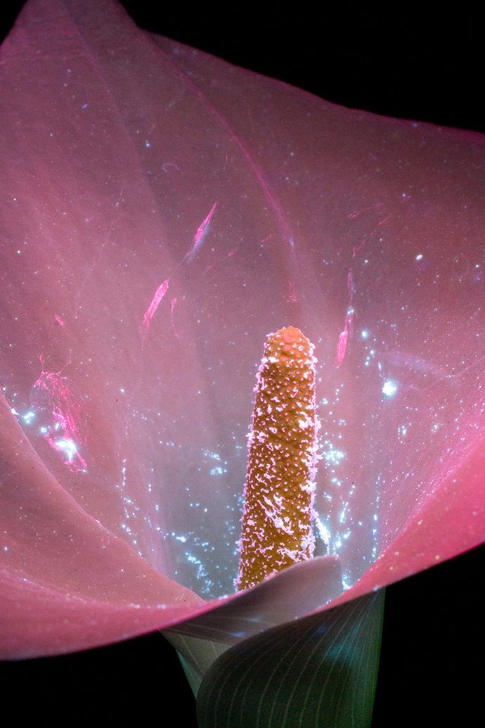 通常情况下,紫外线可以被相机镜头过滤掉,但 Craig Burrows 使用365nm LED 灯拍摄,并通过滤光器使得它仅仅透射紫外线和红外线光。植物吸收了这种紫外线,因而释放了不同波长的可见光,这就使得摄影师能够捕捉到比普通观察条件下更加鲜艳的花色和光芒。