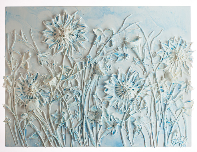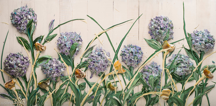 旅行归来的Justin把研究成果应用到自己的画作中,他开始用调色刀蘸着乳胶漆画画,再后来改用丙烯,那种颜料堆叠出来的效果形成了非常有质感的纹理,Justin强化了这种纹理,将画作从平面变成了立体,这种立体纹理的印象派风格也一直延续到了现在。