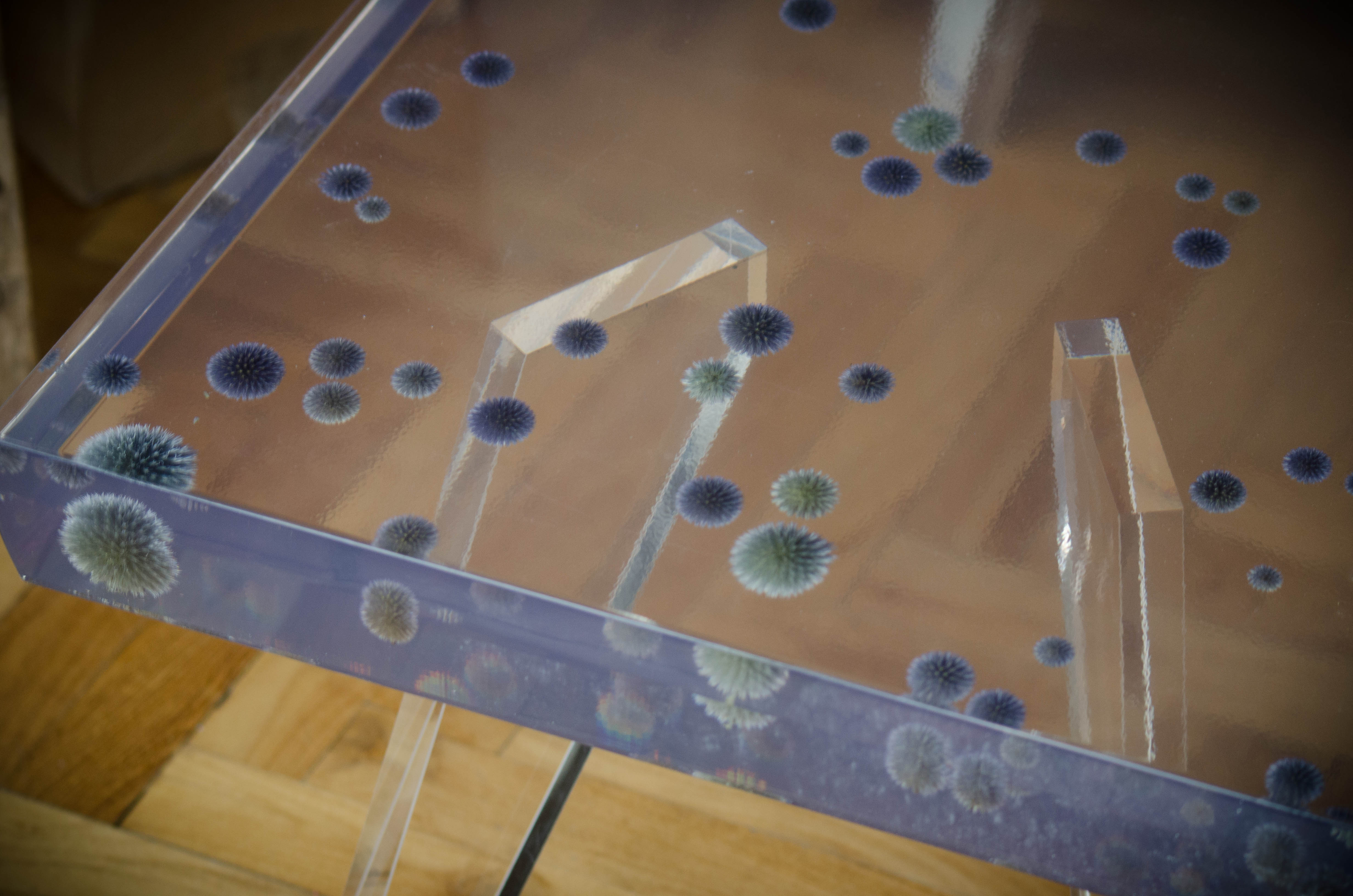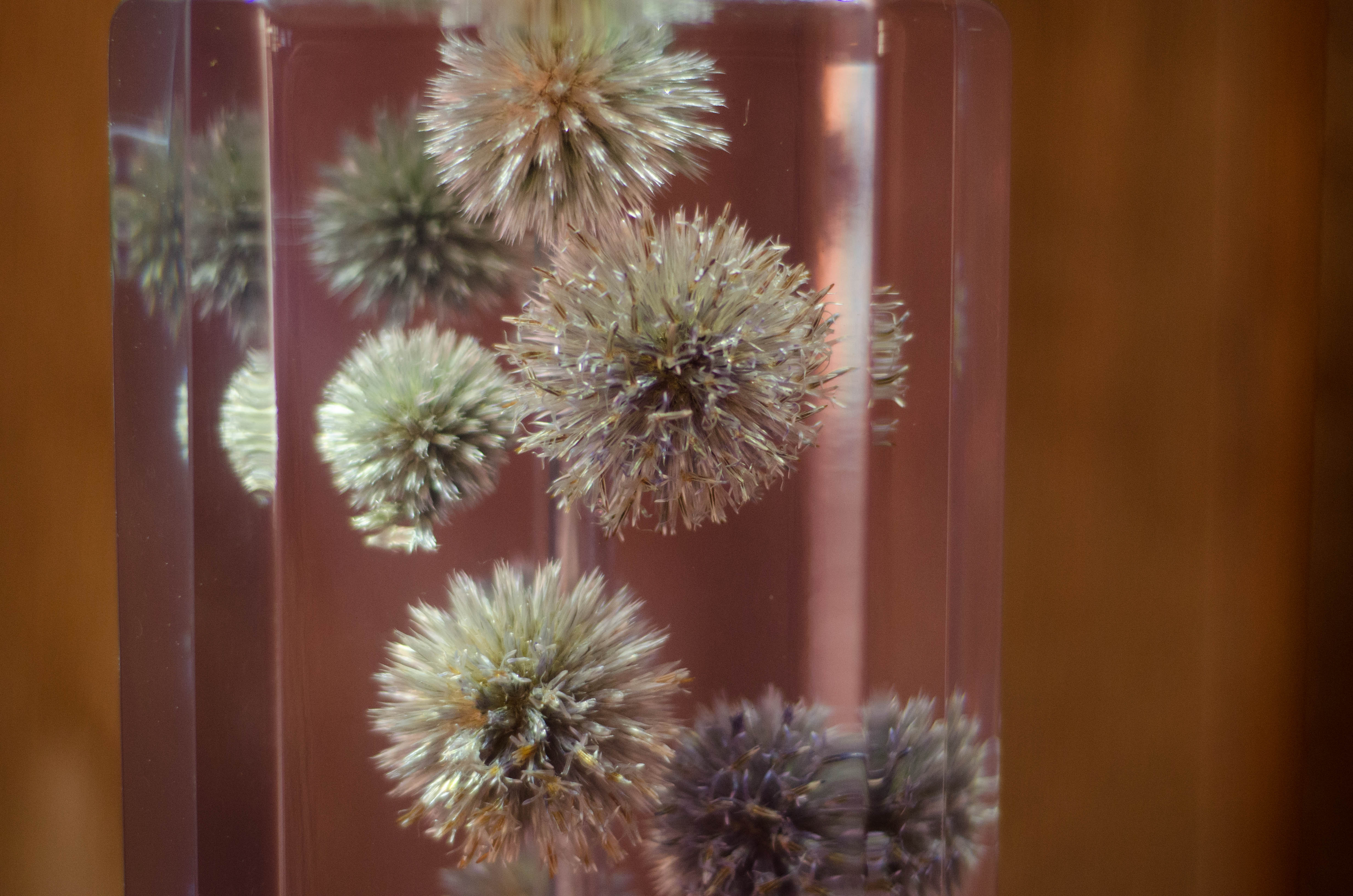 阳光穿过透明的亚克力,映衬出植物与花朵斑驳的影子,在阳光下熠熠生辉。