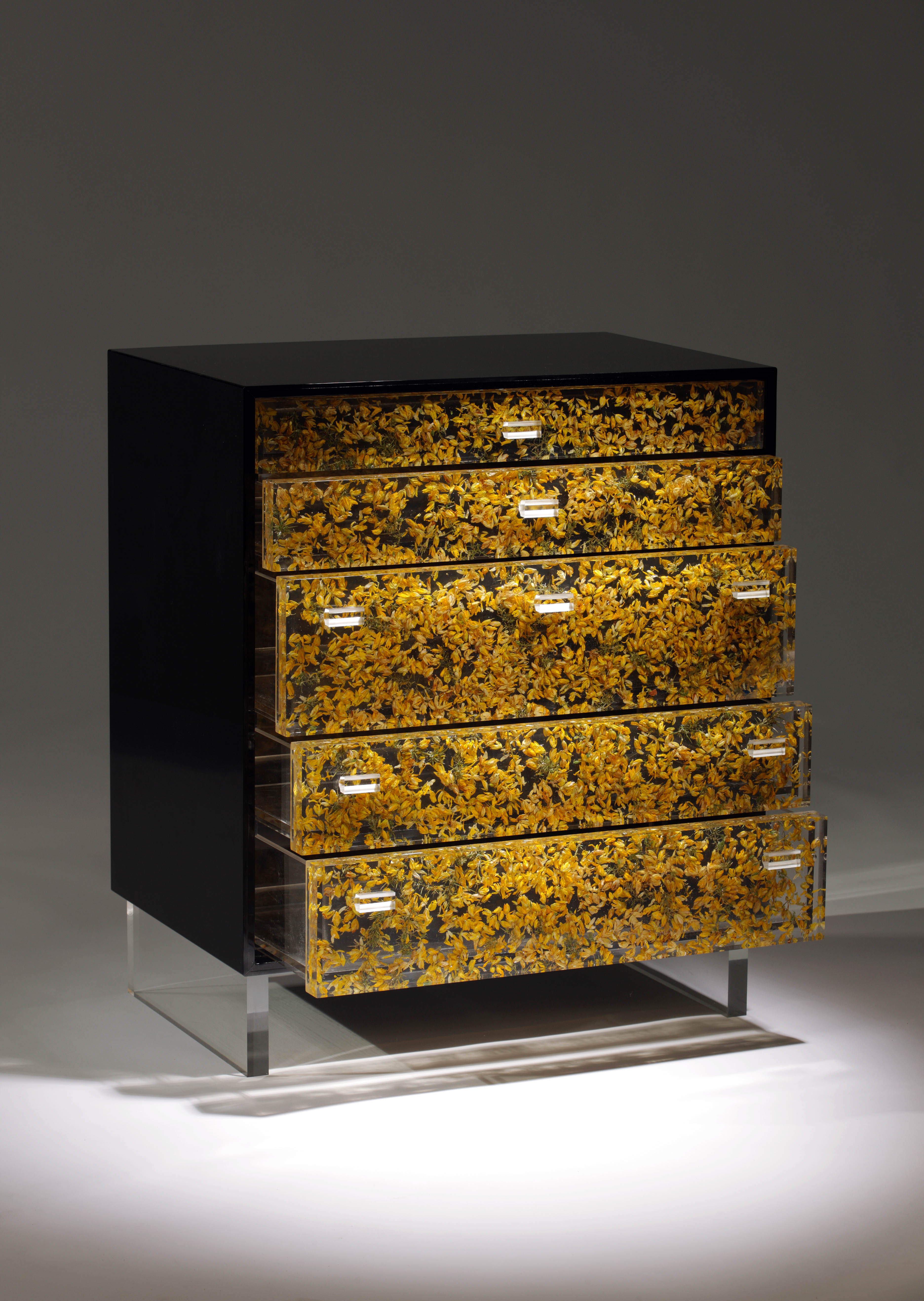 押花是运用大自然中的花卉,经过整理、加工、脱水,保持花的原有色彩和形态,并经过创作者的精巧构思和艺术设计,制作而成的一种艺术品。爱尔兰艺术家Sasha Sykes创作出了一系列以押花为主体的家具及家居装饰品。