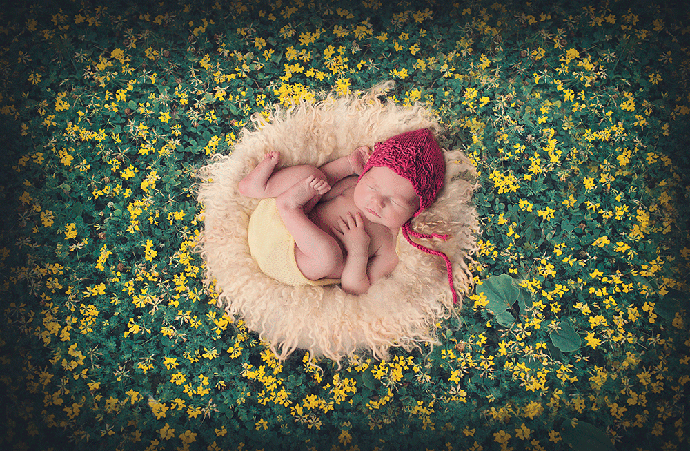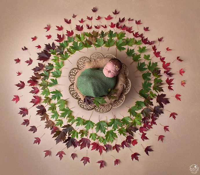 最近,Gabriele拍摄了这样一系列具有同样特征的婴儿照片:地面上用植物摆放成曼陀罗,婴儿安睡在曼陀罗的中心,画面温暖安详而富有诗意。