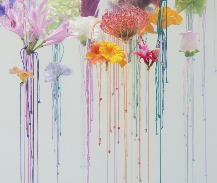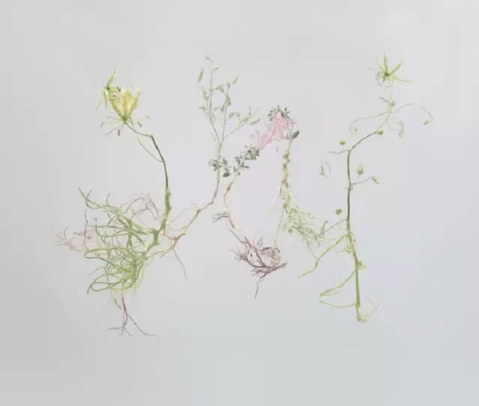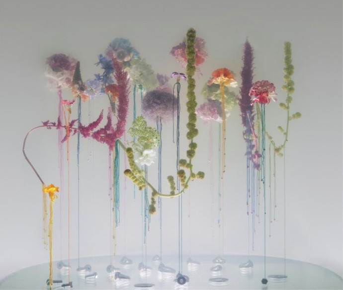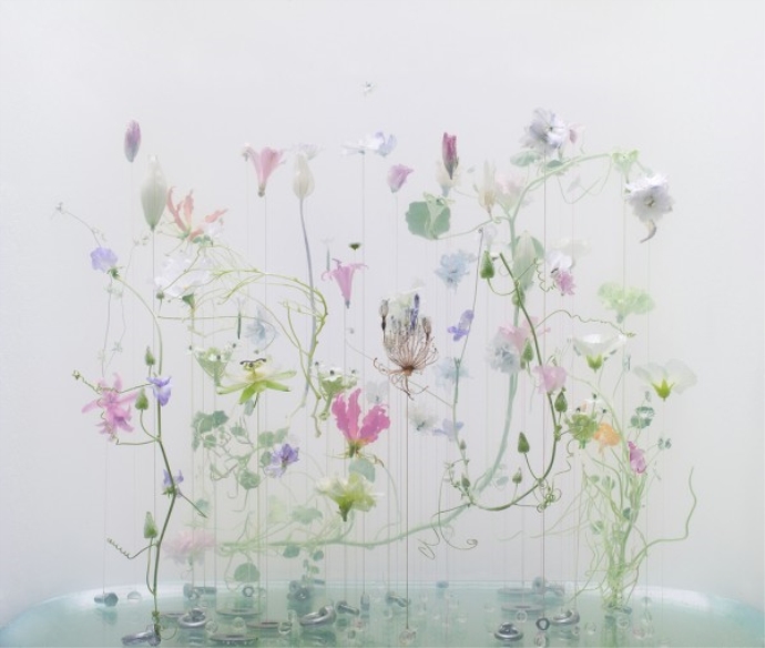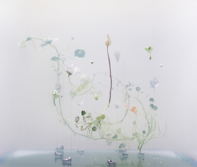 Anne ten Donkelaar使用细绳和金属环将花朵扣留在水中,收放的拿捏像是芭蕾舞者优雅内炼的舞蹈动作。