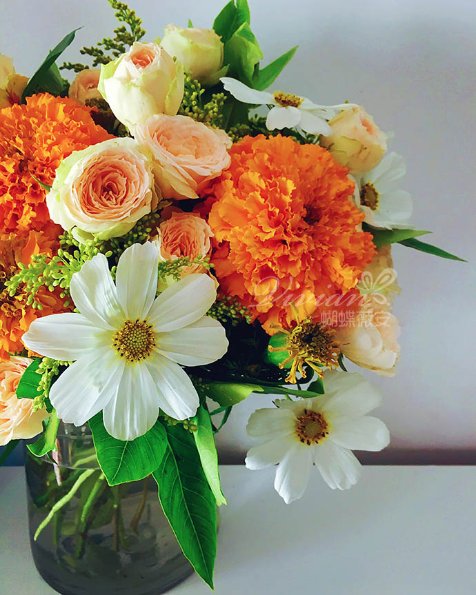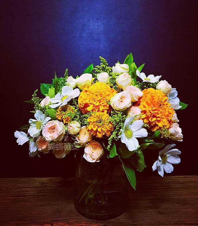 将它配在万寿菊和玫瑰中,则因为色差和形态的关系跳跃的更厉害,有时甚至看起来像蝴蝶在翩翩飞舞。是的,就像一些北方人认为它很接地气,有点土土的一样,我执着的认为它像精灵一样跳跃,恐怕也是一种偏见。
