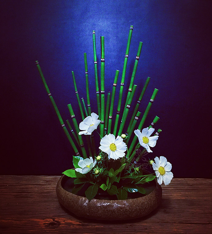 很多人都会用木贼来配比较有份量的花材,但是我觉得木贼的粗线条和刚毅感,更能凸显格桑花的娇柔。