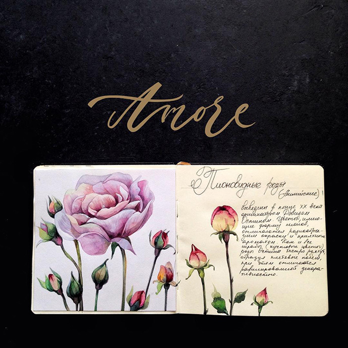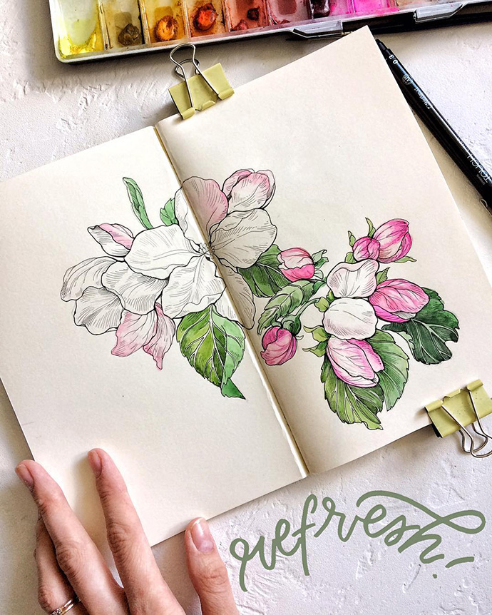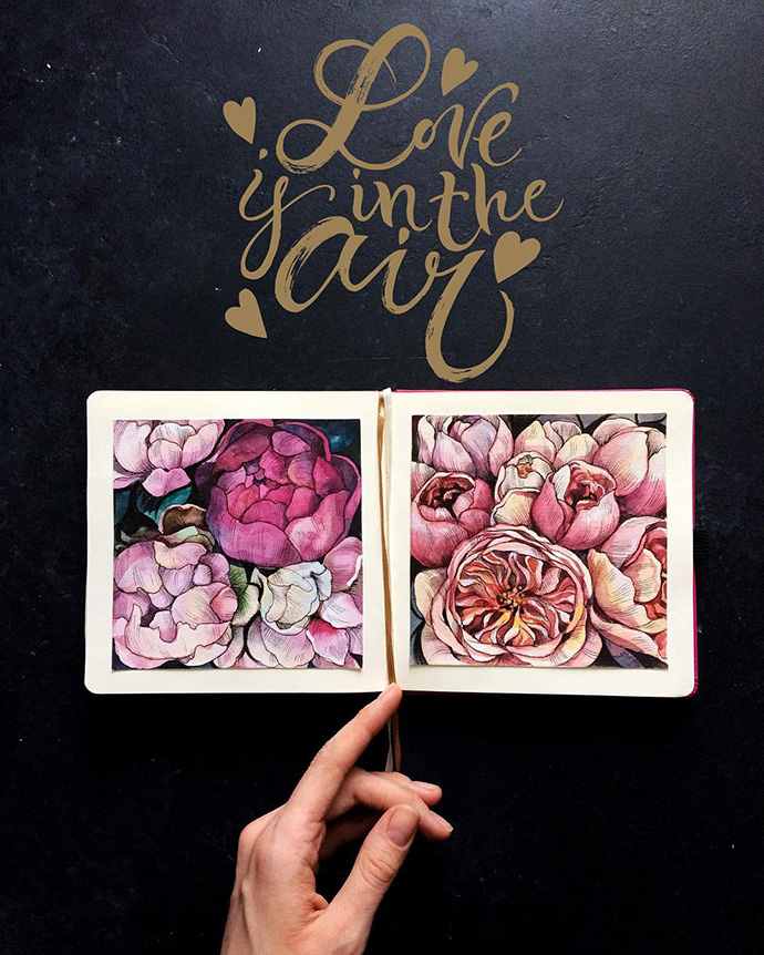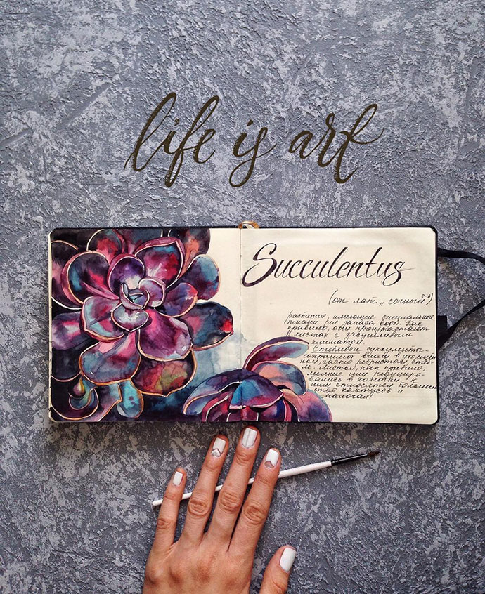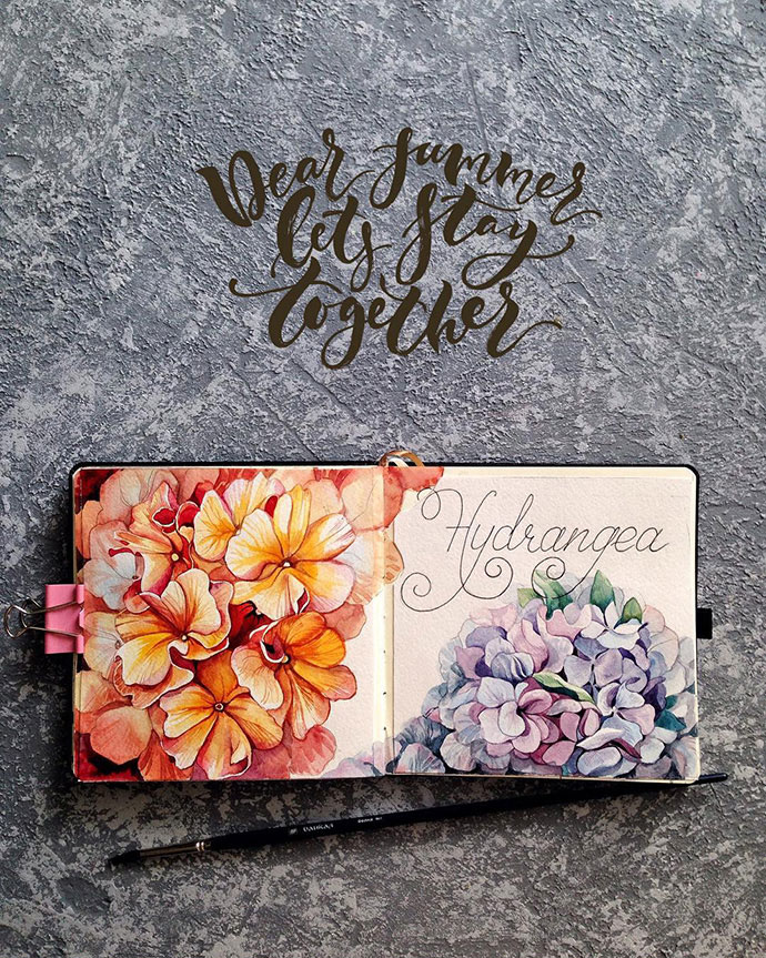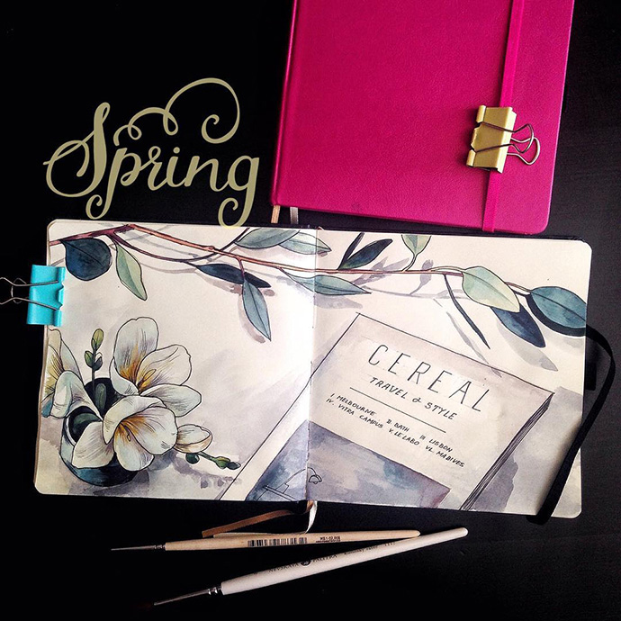 Yulyua的水彩本子或花团锦簇,或清新淡雅,还常常像时尚杂志一样跨页构图,再辅以优美的文字。对于手账和水彩爱好者们来说是非常值得借鉴的。
