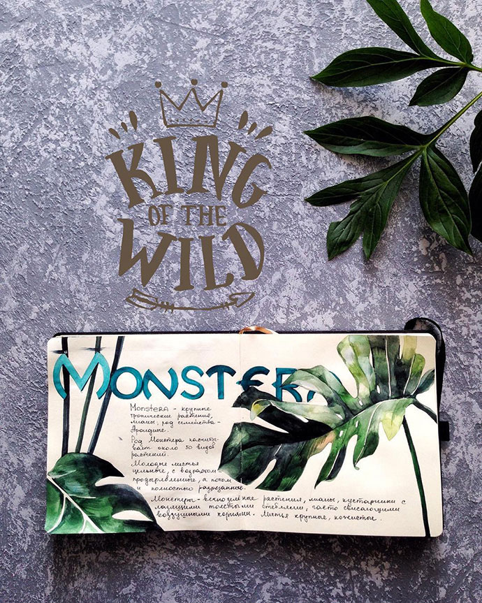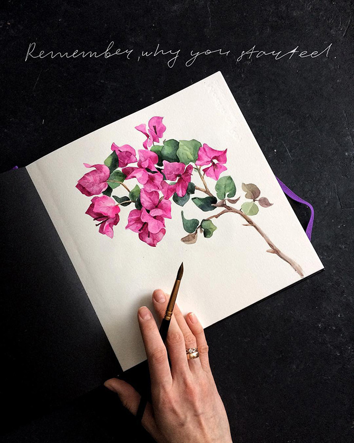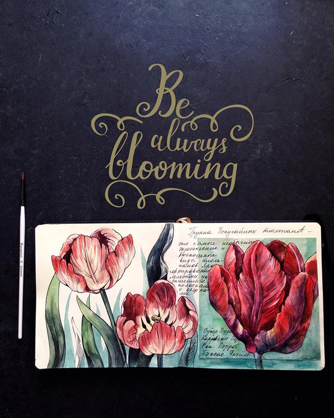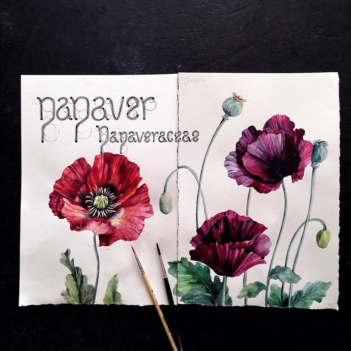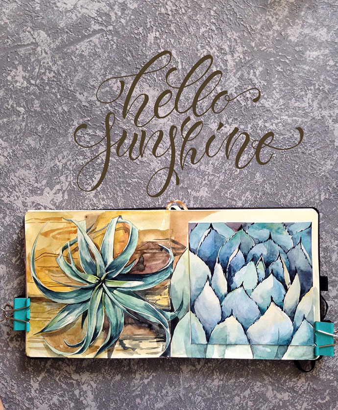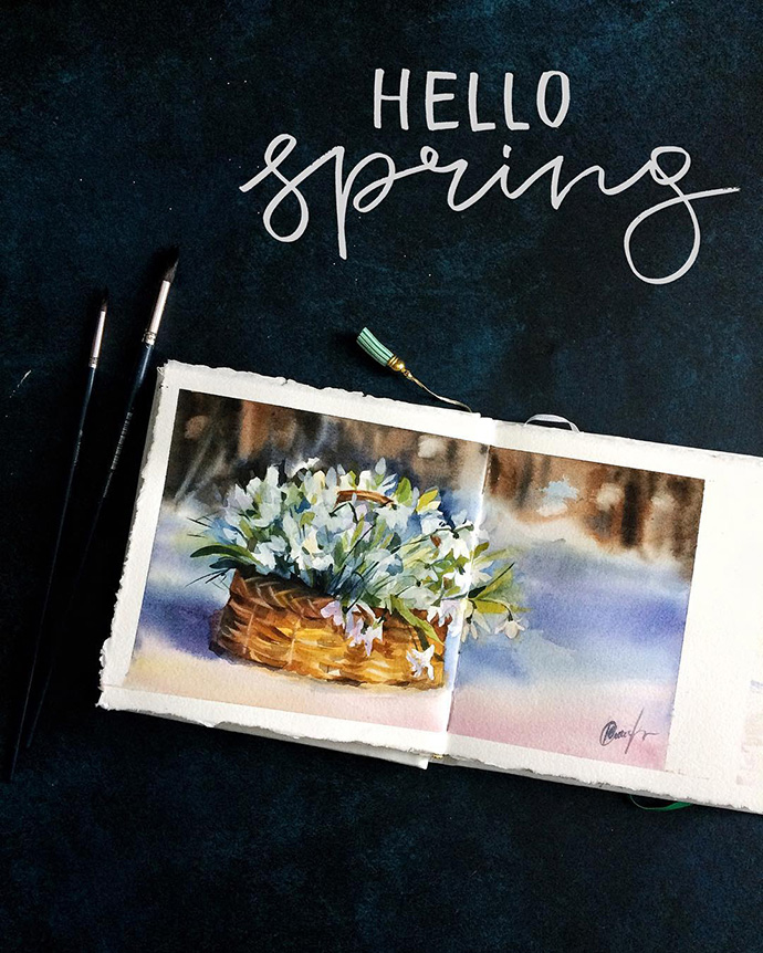 Yulyua的水彩本子或花团锦簇,或清新淡雅,还常常像时尚杂志一样跨页构图,再辅以优美的文字。对于手账和水彩爱好者们来说是非常值得借鉴的。