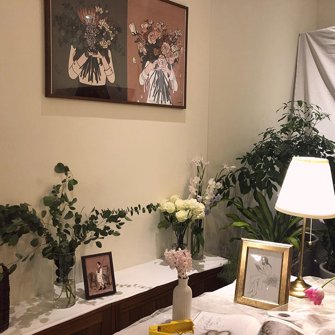 最近她画的一系列作品描绘了女孩子在花间工作的样子、手捧鲜花挡住脸的样子、肩上扛起巨型花束的样子……可以说是花艺师日常的真实写照。