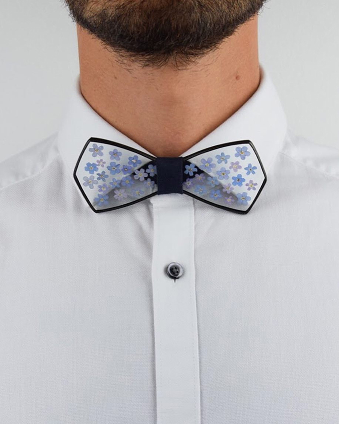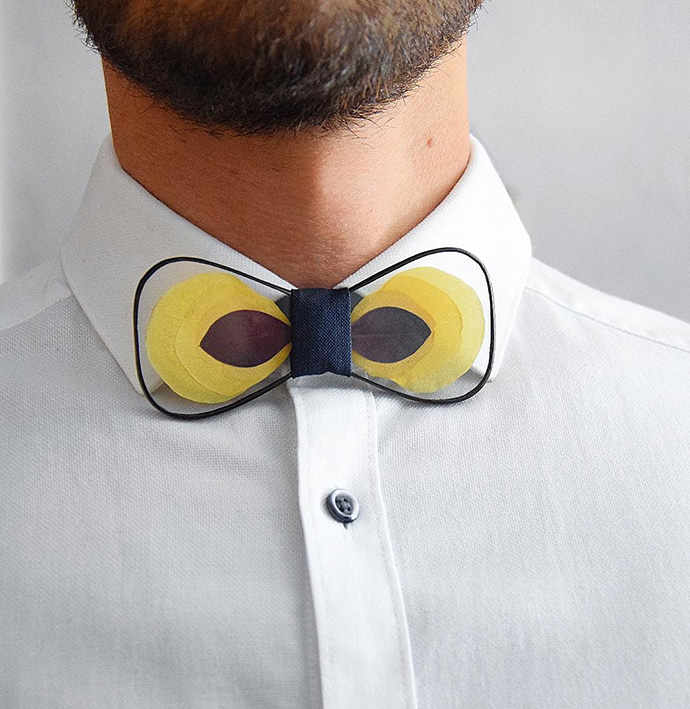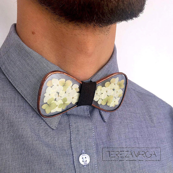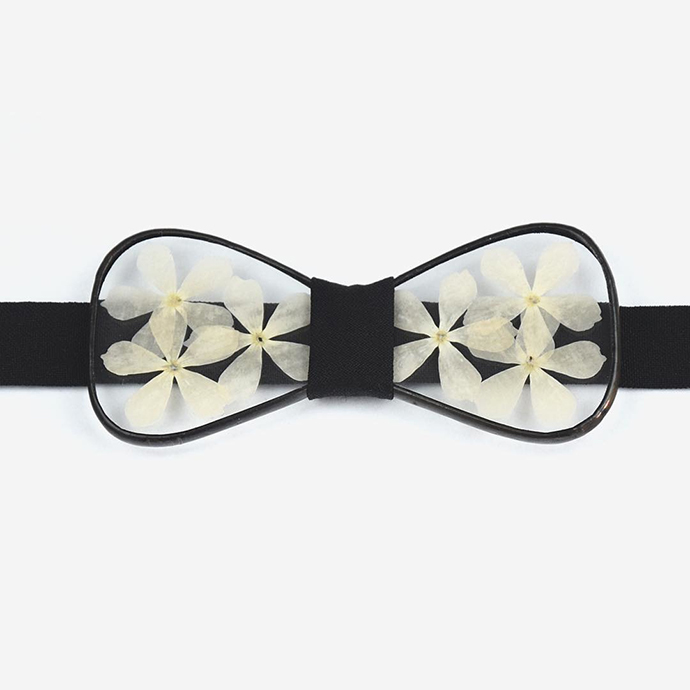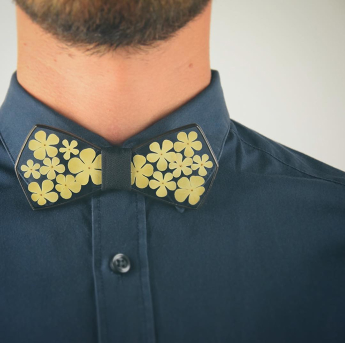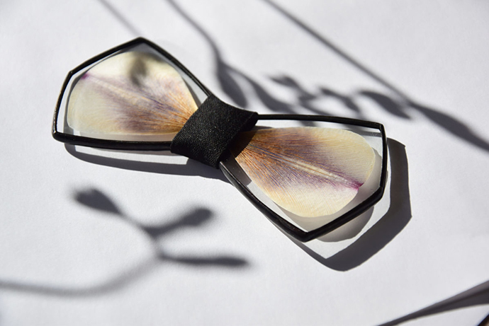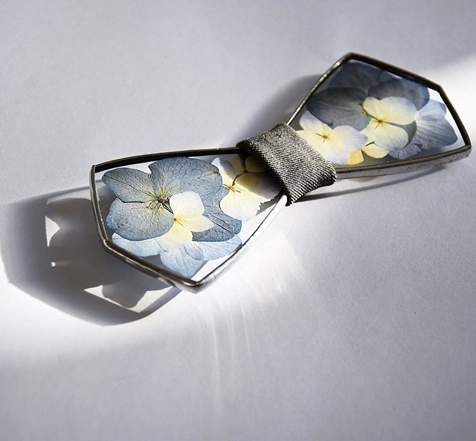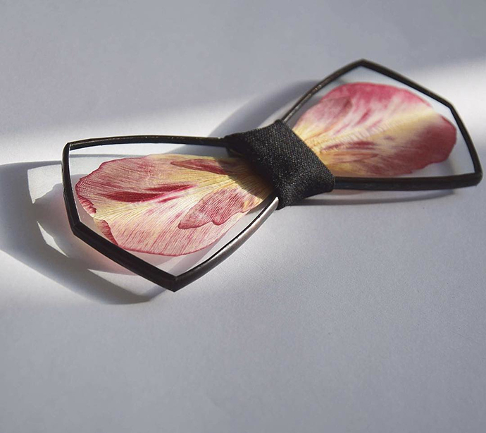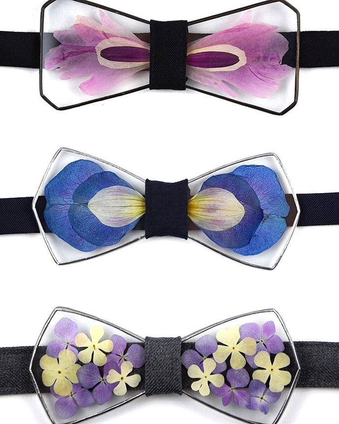 Tereza Varga工作室出品的押花装饰物以简洁大方的几何造型为主,押花被放置在各种几何造型的玻璃框中,下面的押花领结是最受欢迎的。