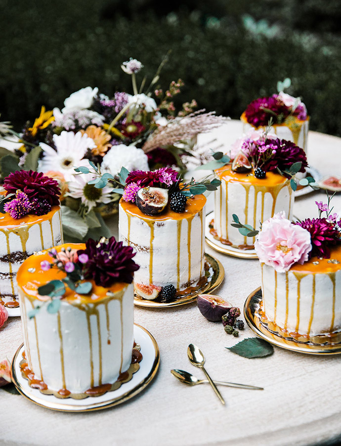 蛋糕胚上除了鲜花外,也可以插着的彩虹棒棒糖、多边形创意巧克力与滴落的橙色果酱遥相呼应,绝对是炫彩又吸睛的一款淋面蛋糕。