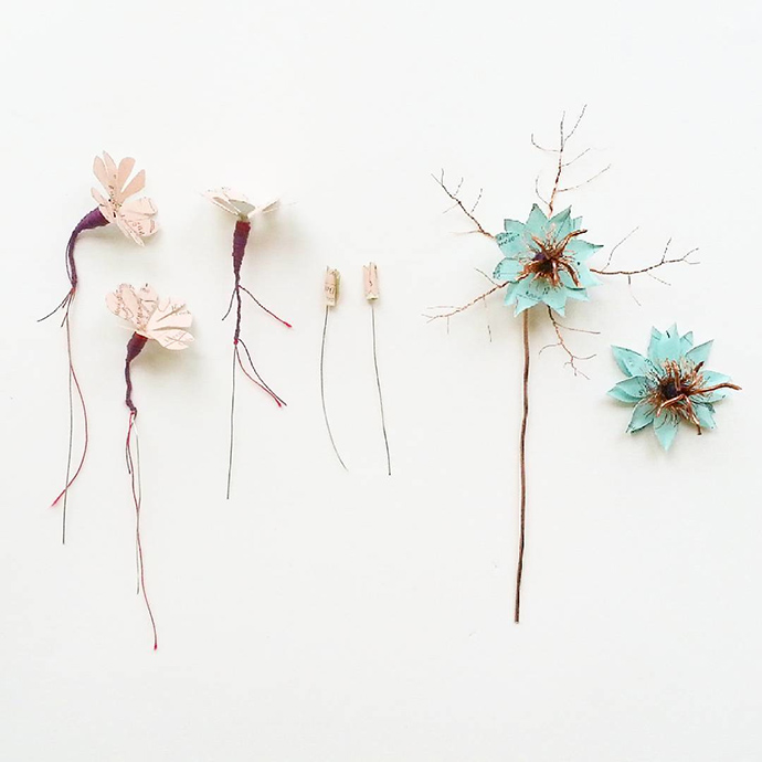 纸是Kate最喜欢的创作媒介,纸的属性很适合她用来塑造植物和昆虫的立体造型。此外还会用到铁丝、缝纫用的线和布料等。